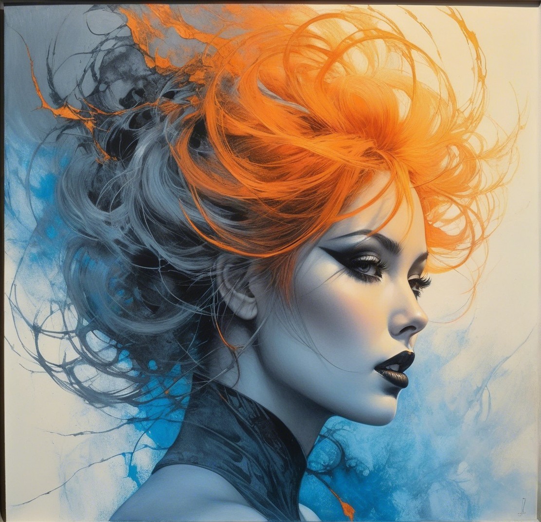 The image features a striking profile of a woman with vibrant orange hair contrasted against a monochrome background. Her makeup is bold, emphasizing her features and artistic expression.