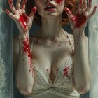A young woman with short, wavy red hair stands in a dimly lit room, her hands gently touching her face. She wears a simple dress and has freckles, with blood-like spots on her arm, evoking a haunting atmosphere.
