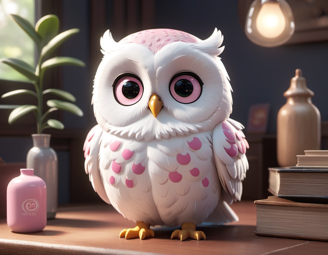 Prompt: Cute adorable little white owl with pink spots, reflections in the eyes,unreal engine, cozy interior lighting, art station, detailed digital painting, cinematic, character design by mark ryden and pixar and hayao miyazaki, unreal 5, daz, hyper realistic, octane render