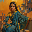 A beautifully dressed woman sits against a vibrant sunset, wearing traditional attire with intricate jewelry. Ancient architecture and towers rise in the background, creating a captivating atmosphere.