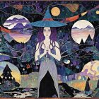 A mystical scene features a woman in a flowing gown holding a flower, set against a starry sky with mountains and celestial bodies, blending elements of nature and fantasy.