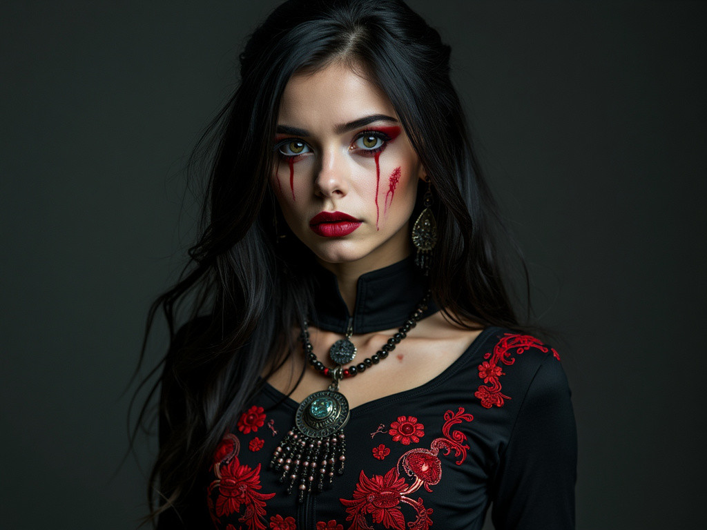 A striking portrait of a woman with long, dark hair and bold makeup featuring red accents. She wears a black outfit adorned with red embroidery and ornate jewelry, exuding a captivating presence.