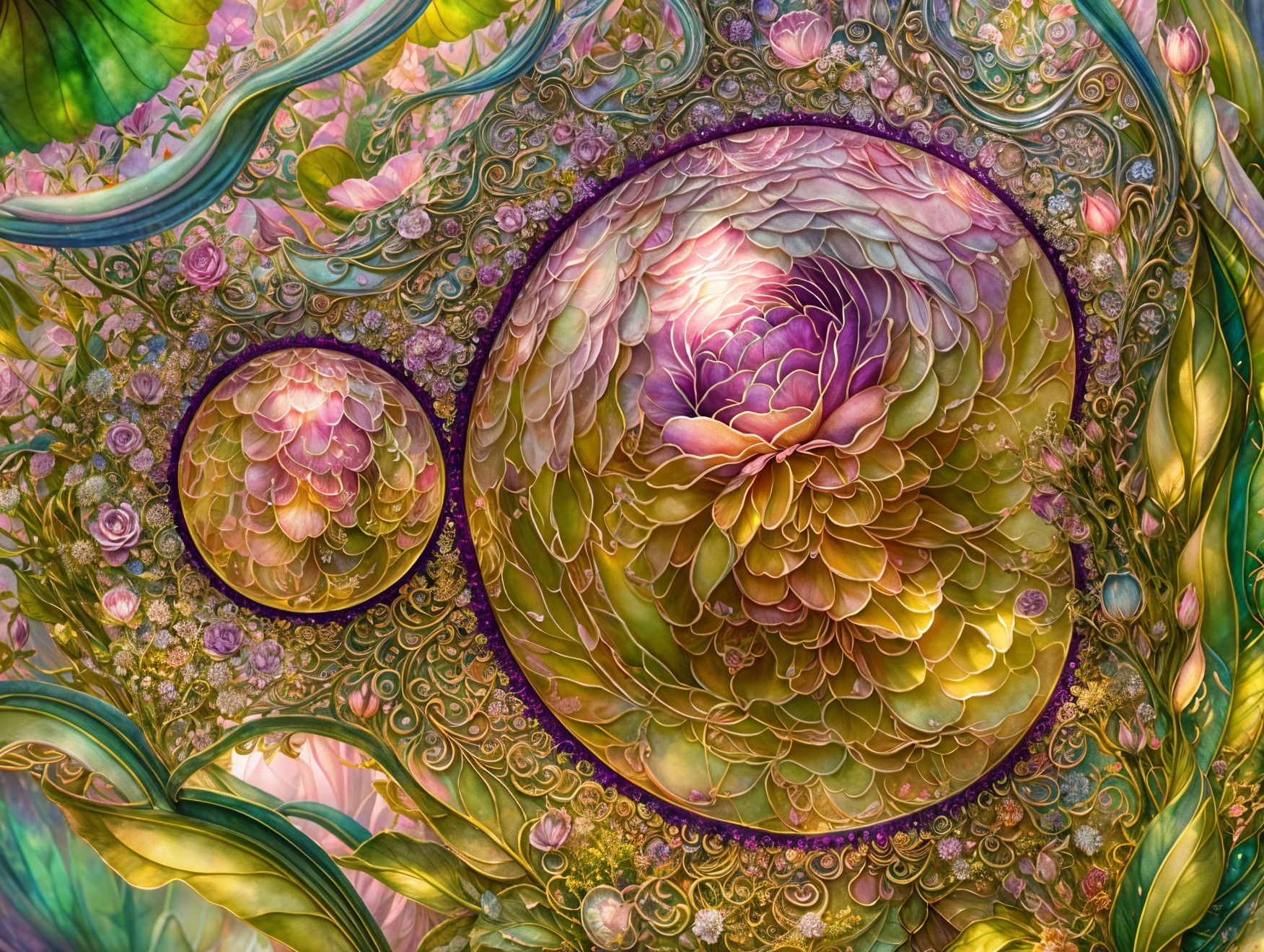The image features intricate floral patterns with soft hues of pink and green, highlighting circular arrangements of roses and lush leaves, creating a harmonious organic design.