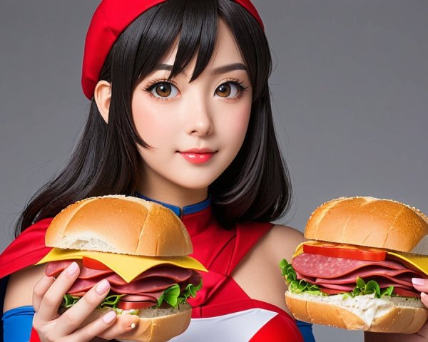 A whimsical character with vibrant hair and playful attire strolls along a lively boardwalk, radiating charm and joy. Surrounded by colorful stalls and cheerful visitors, she embodies summer fun.