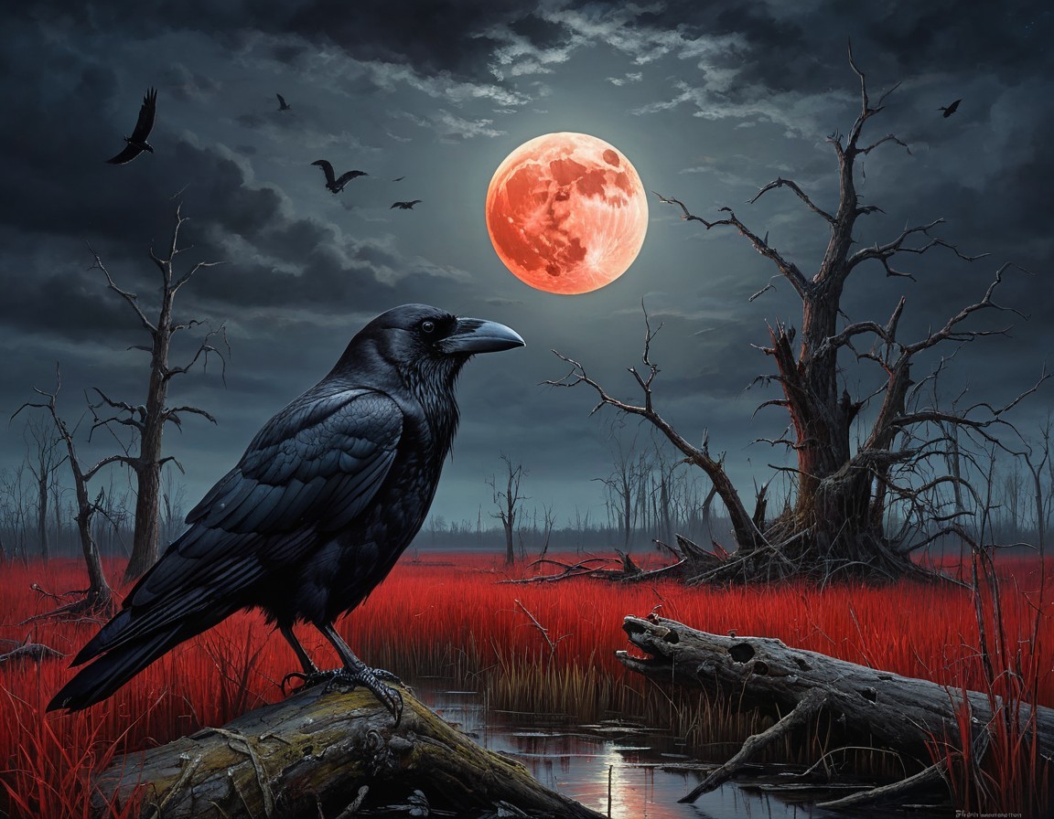 A solitary raven perches on a branch near a still, eerie red marsh. The scene is illuminated by a large, glowing full moon, casting a haunting atmosphere over the dark, twisted trees.