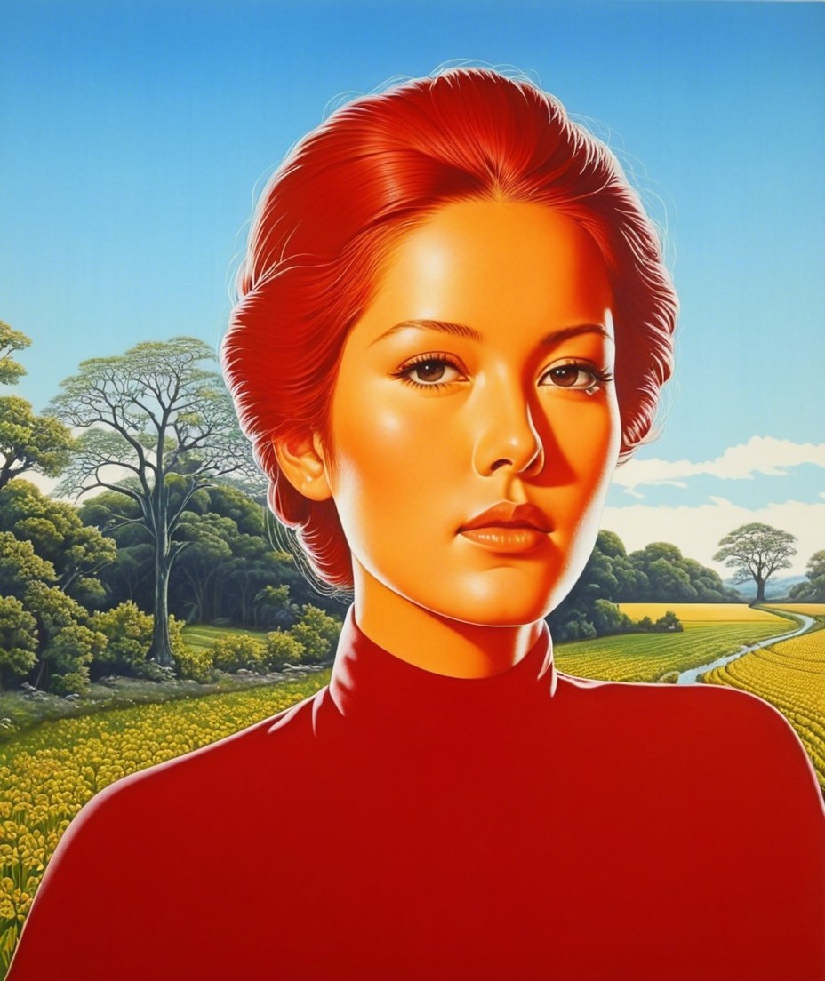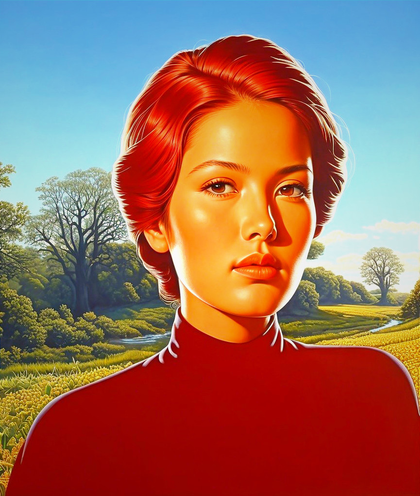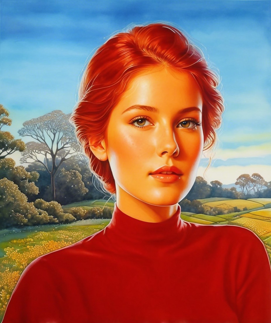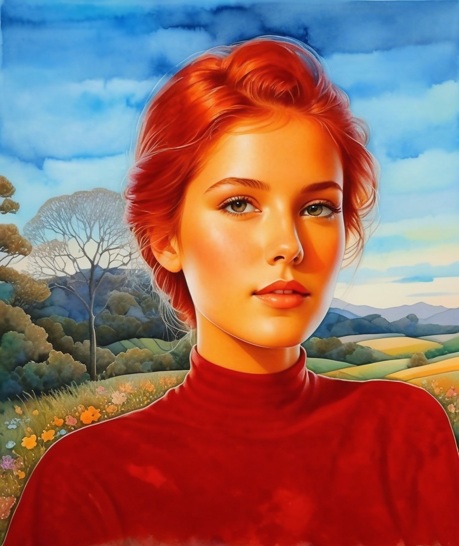 A young woman with vibrant red hair and striking features poses against a scenic backdrop of rolling hills and a blue sky. She wears a red turtleneck, exuding warmth and confidence.