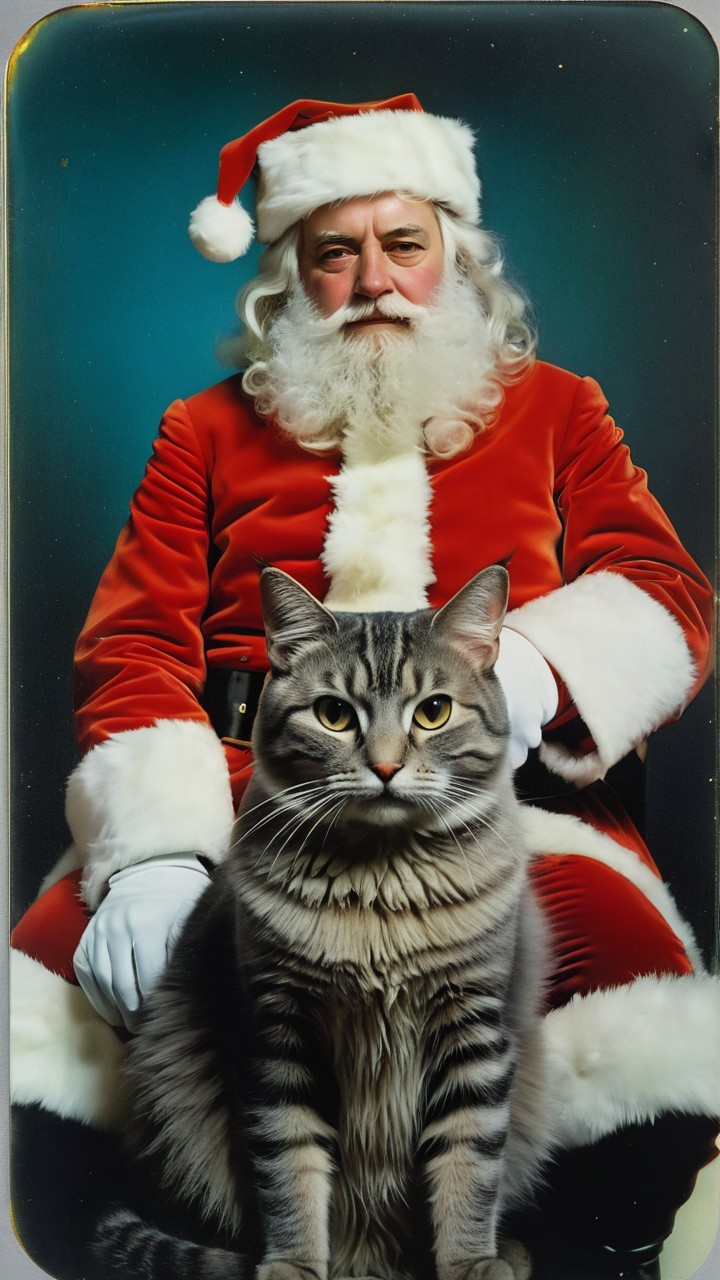 Prompt: "Polaroid bedtime Santa Cat, transfer & emulsion lifts, vertical translucent image, optical glitch anomalies, databending, cracked analog errors, tintype-inspired portrait, extreme erroneous subsurface scattering; watercolor in glass, wrapped in stretched aluminum/latex membrane; emotion by Hieronymus Bosch, Goya, Hussar, Gray, Beksinski, vibrant colors, gothic elements."