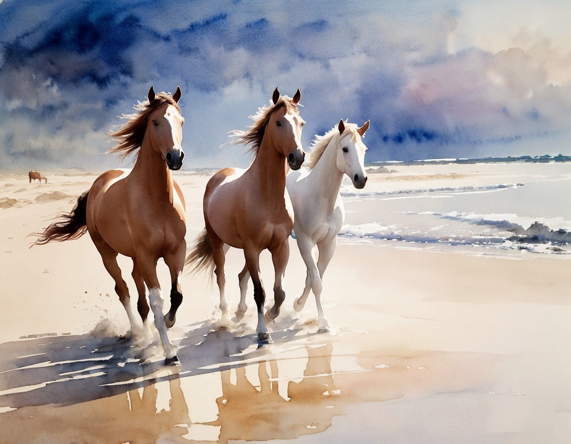 Three horses gallop along a beach, with dynamic watercolor strokes capturing motion and coastal light.
