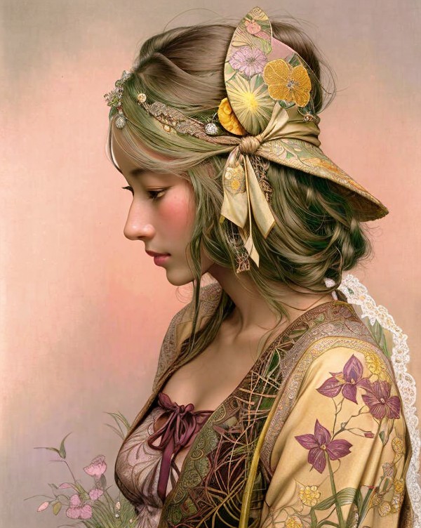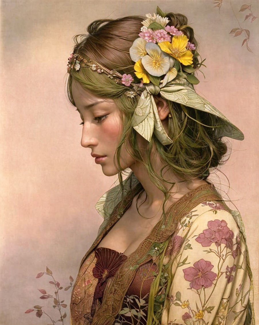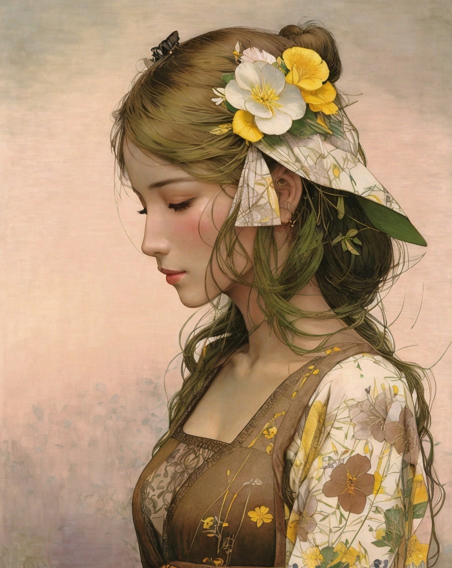 + Prompt:Beautiful woman. Deep brown, lemon yellow, olive green, grass green She Beauty is upon you like the dew on grass each morn. Why are you so sad