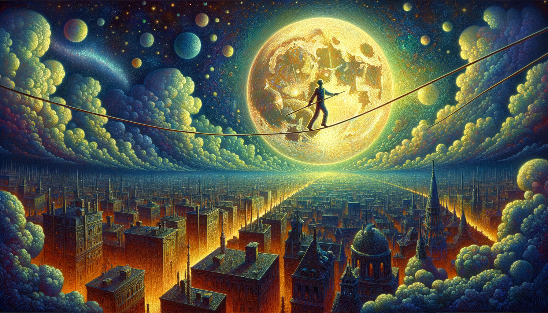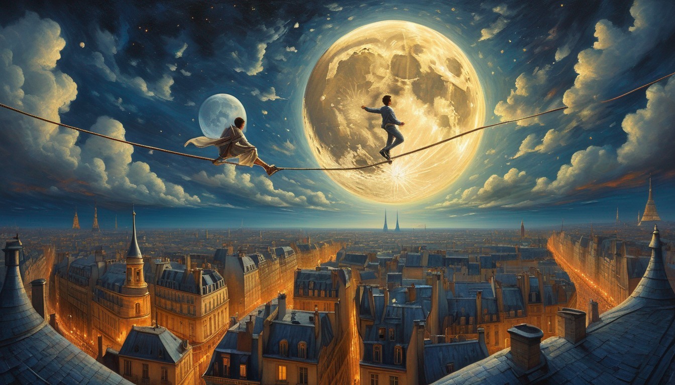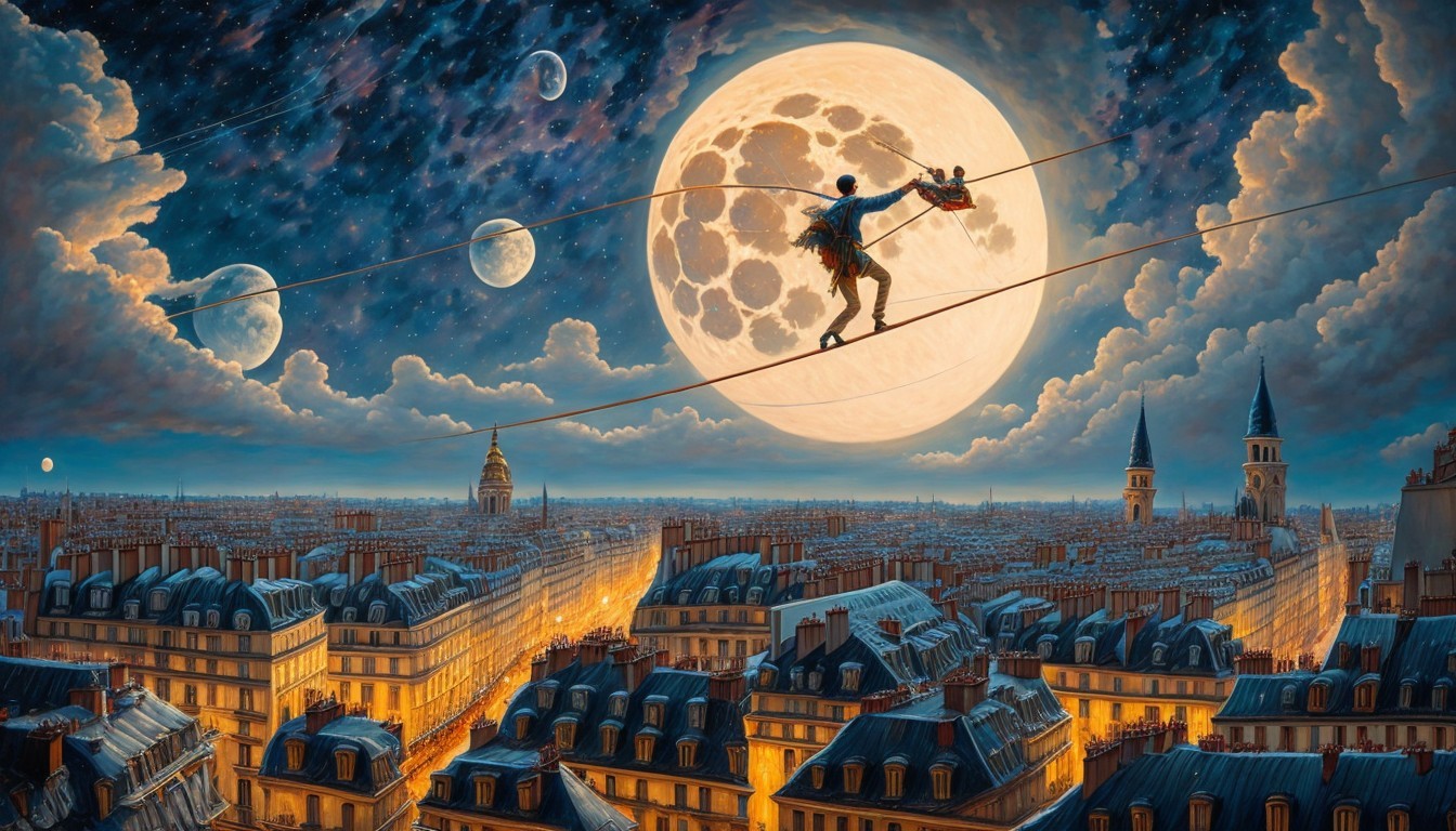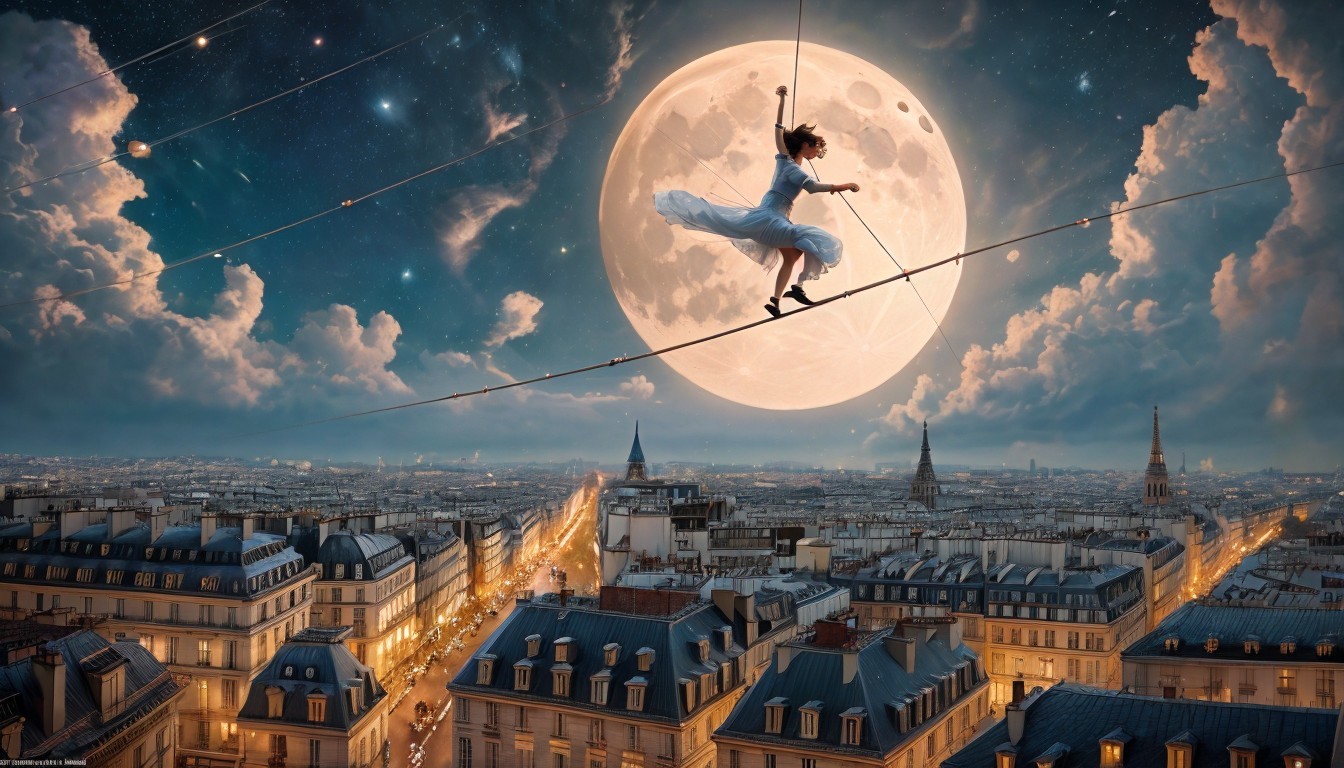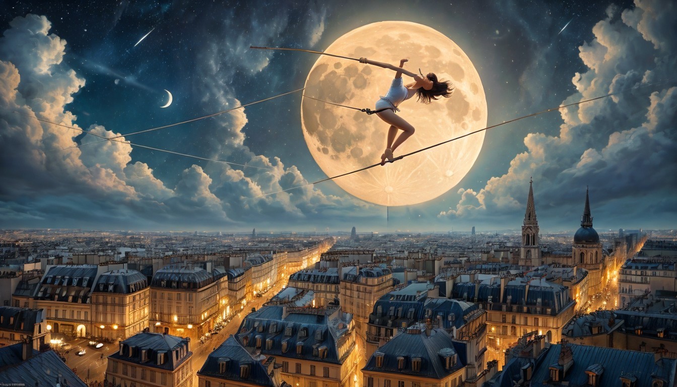a tightrope walker-ballerina climbs to the moon, the beautiful rooftops of the old town of Paris can be seen at the bottom