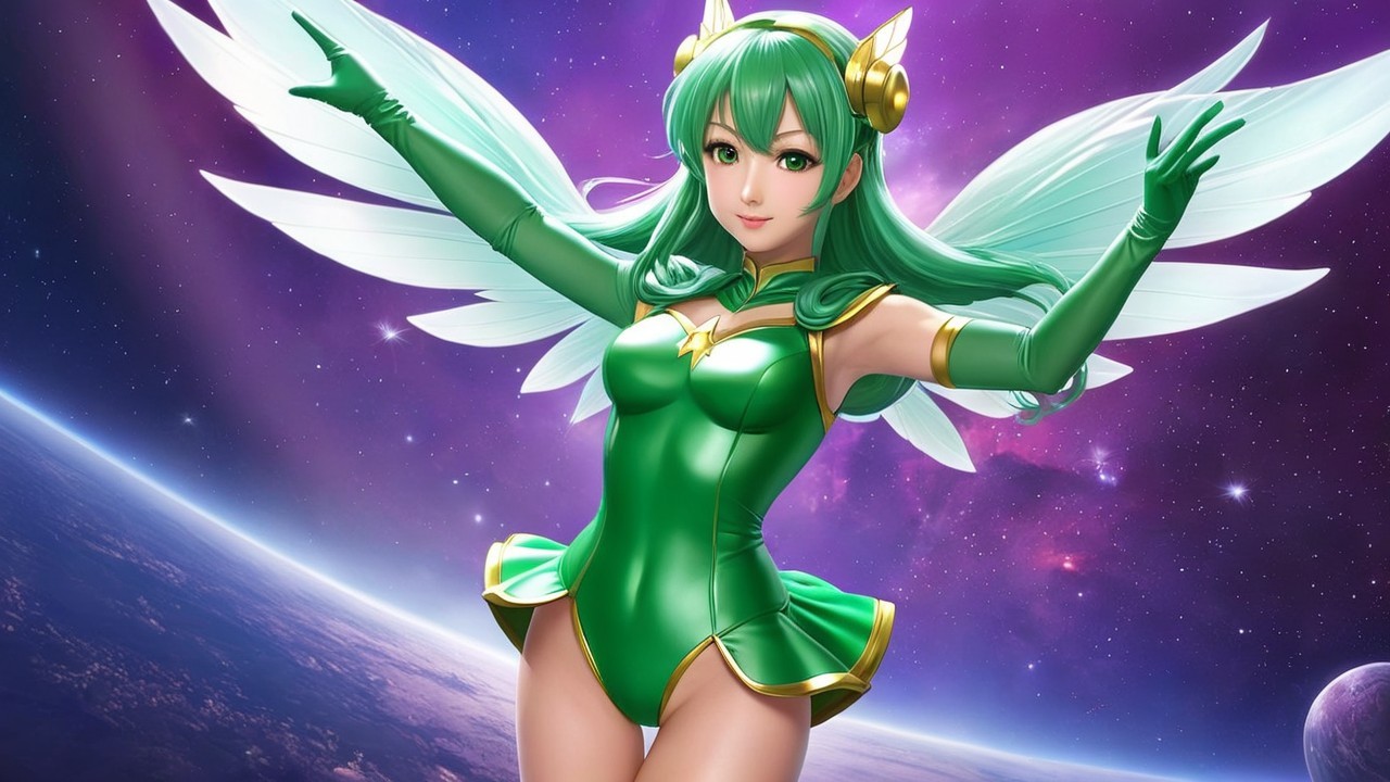 A charming anime sylph superheroine with delicate wings and vibrant hair, she embodies grace and courage. With a playful spirit, she uses her powers to protect nature and inspire hope in her community.