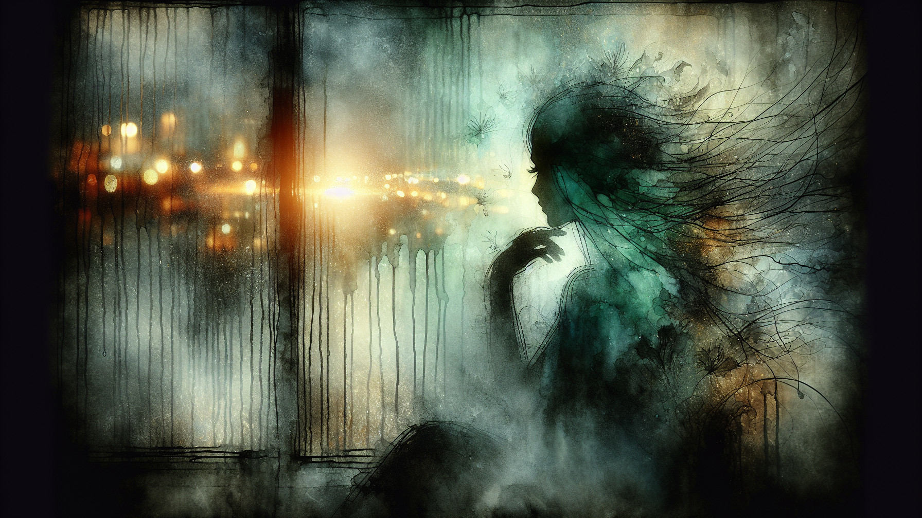 A silhouette of a woman gazes out a misty window, her flowing hair blending with ethereal colors. Soft lights from the city reflect in the background, creating a dreamlike ambiance.