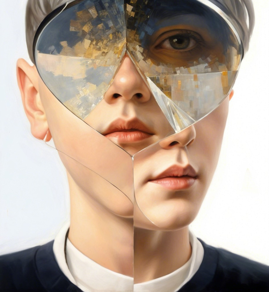 Reflections of the mind, fragmented, abstract mask, split face, no eyes