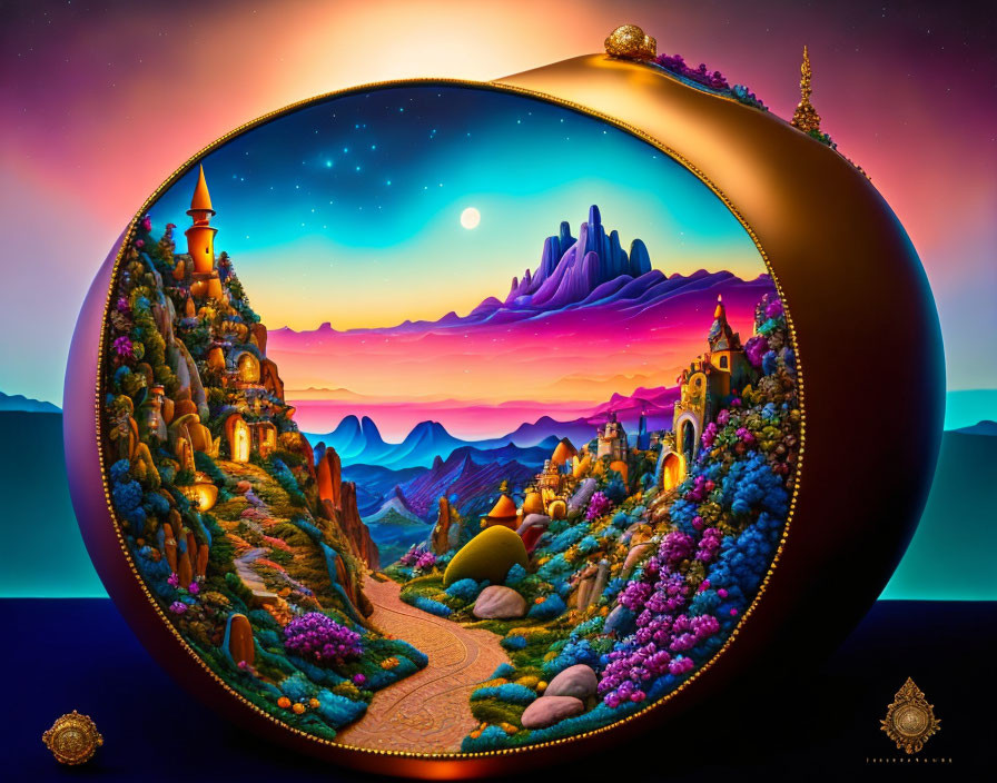 still life a figurine and landscape, the best masterpiece of antique and jewelry art, fantastically beautiful, inspiring, attractive, patchwork Patty sewing together the magic vision path, small cozy country houses, a stream, beautiful manicured gardens. Surreal. Incredibly detailed and ornate. Realistically painted. Utopian dreamscape fantasy. in the background landscape, in the sky stylized golden stars and cosmic are landscapes.