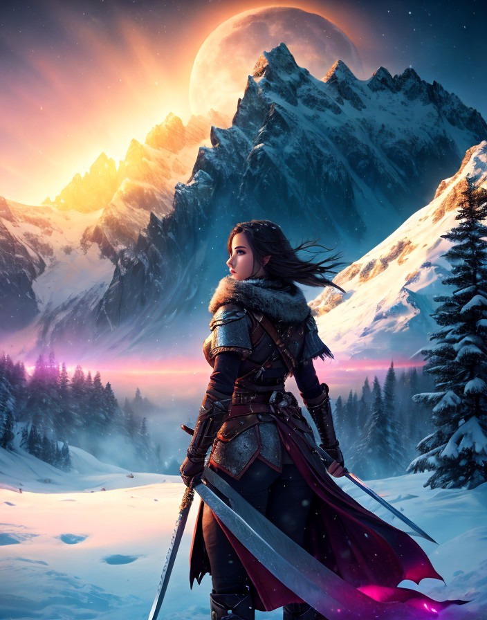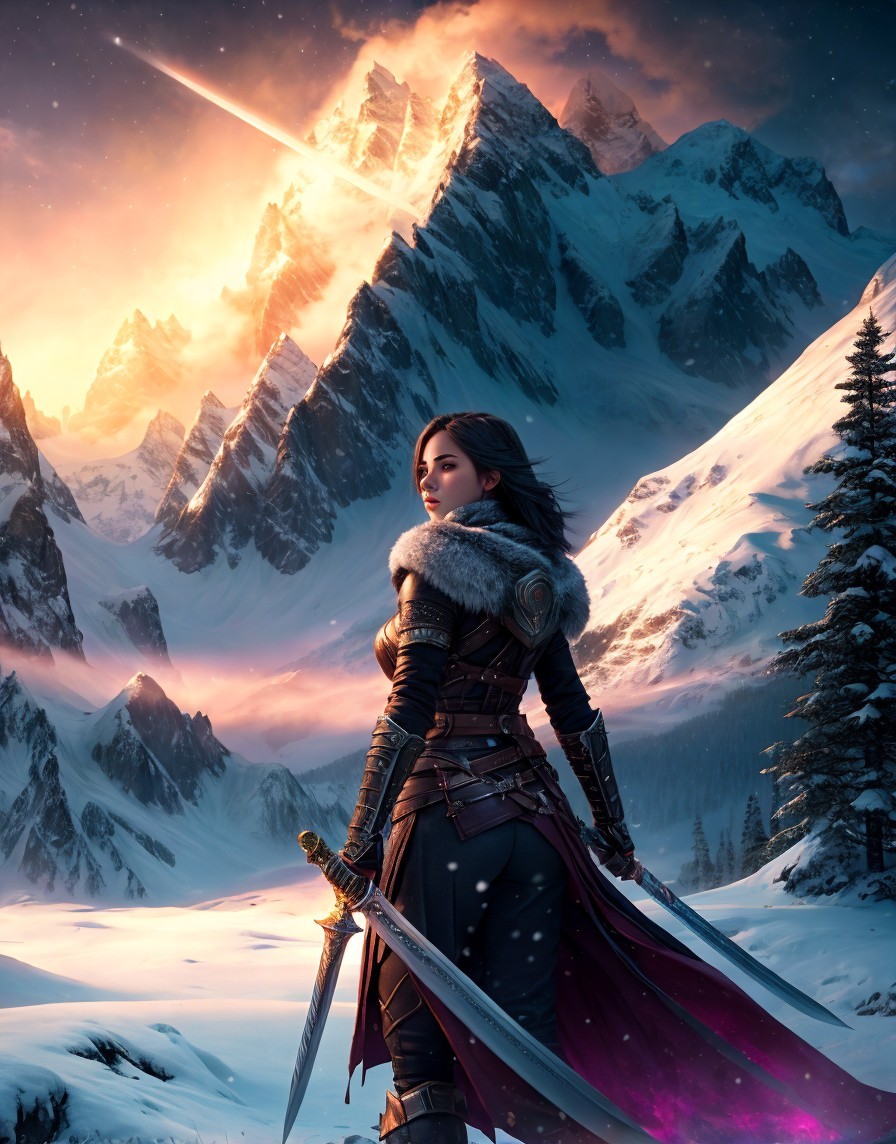 A warrior woman stands in a snowy landscape at dusk, sword in hand, with majestic mountains in the background.
