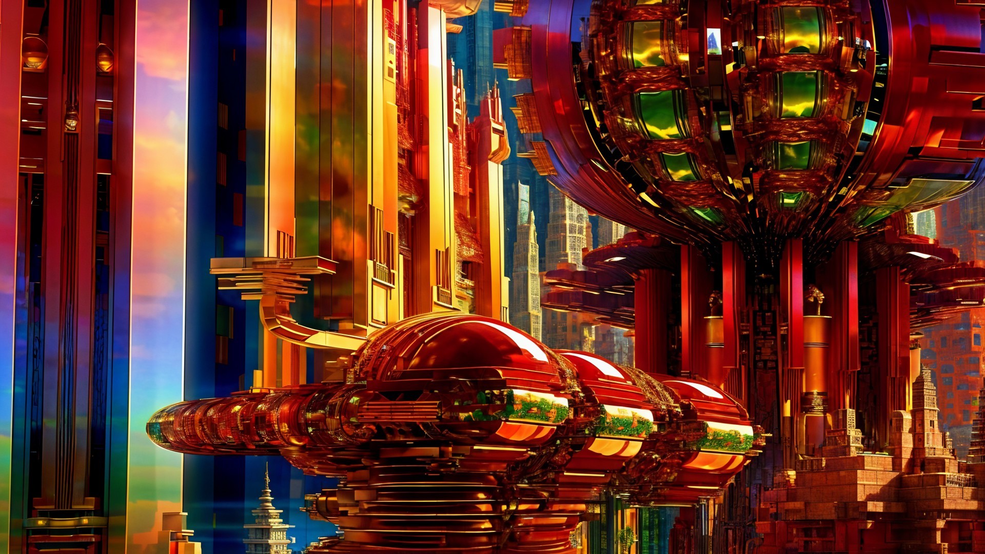 A vibrant, futuristic cityscape featuring intricate golden structures, colorful reflections, and lush greenery. Towering skyscrapers and a bright sky enhance the surreal, imaginative atmosphere.