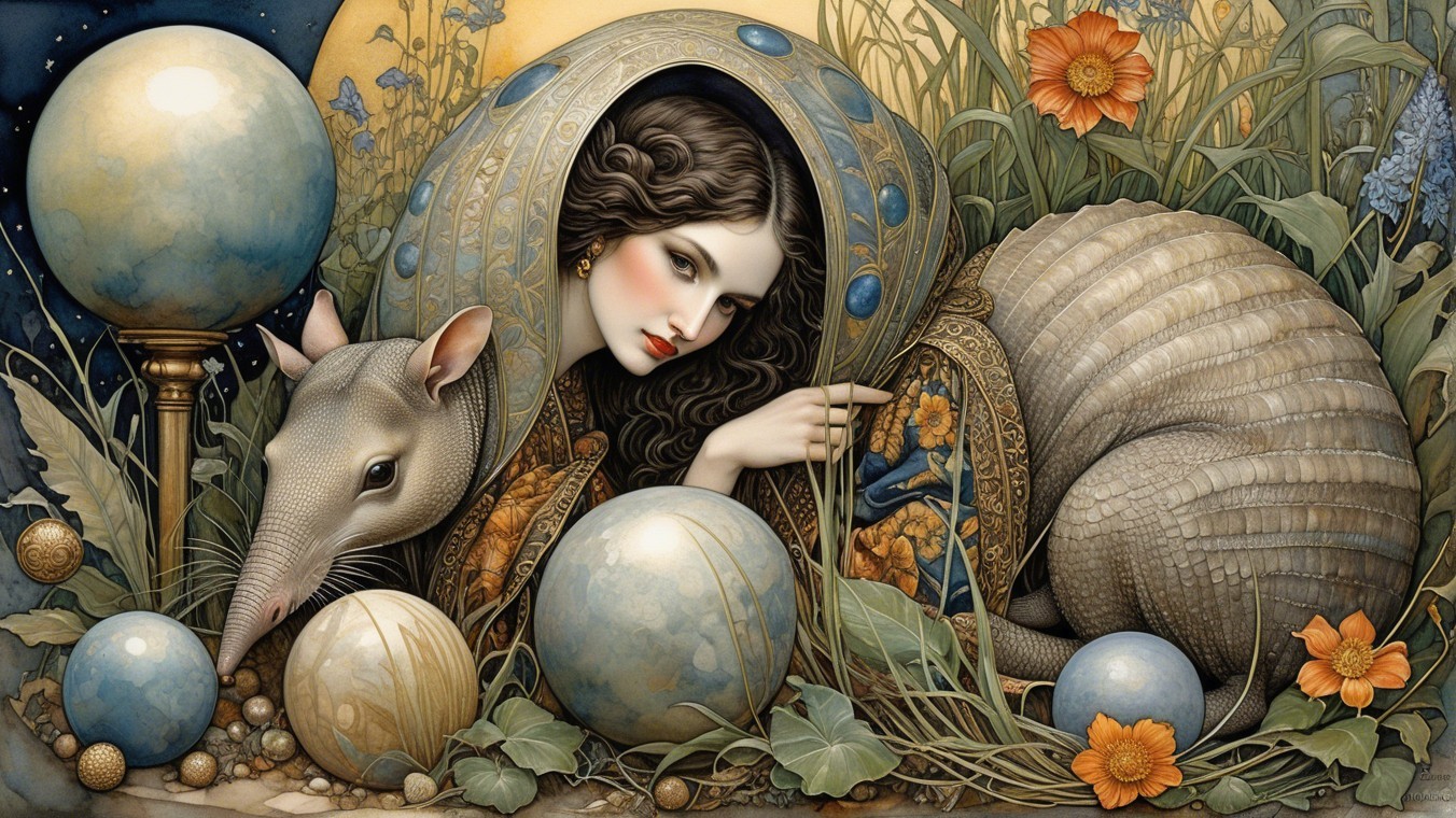 A serene woman draped in a patterned shawl rests beside an armadillo among vibrant flowers and celestial orbs, blending nature and fantasy in a tranquil, artistic scene.