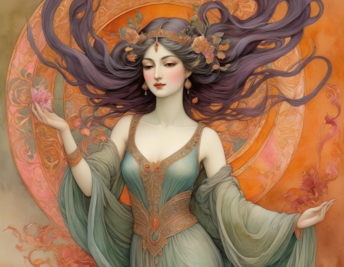 Sylph – A mythological air spirit. 3rd century Persian miniature art, pinkish, puce, plum-amber, silver, sage green, paprika, Velvet Black, Shabby, Dull Gold, Amber Gray, Golden Ratio, Surreal Fantasy, Elegant, High Definition Ultra Fine 3D Line, Zenangle Style, Watercolor Patchwork , Arthur Rackham Style, Paul Kidby, , Jacek yerka, Extremely Detailed, Intricate, Thoughtful, HDR, Fractal, Beautiful, Award Winning, Fantasy Look, Fantasy, Crisp Quality