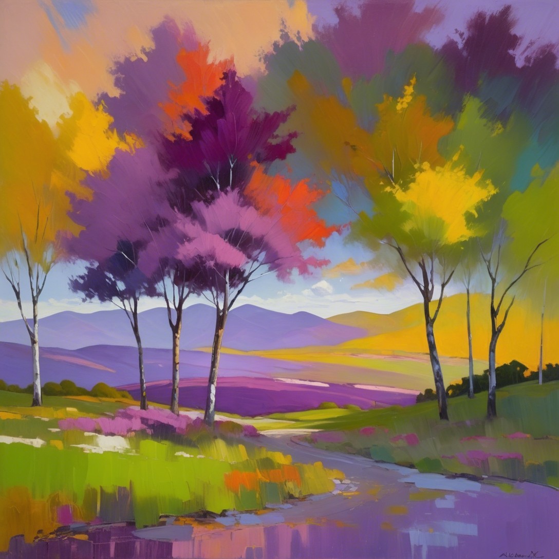 + Prompt:Create an abstract landscape painting featuring two prominent trees on either side, characterized by thick, expressive brush strokes. The trees should have textured bark, with white and gray tones, and vibrant green leaves swaying gently in the breeze. In the background, depict a bright blue sky with fluffy, white clouds, blending seamlessly into a range of rolling purple mountains that recede into the distance. The ground should be a rich blend of earthy tones, with patches of orange and deep brown earth contrasting against a winding path that meanders through the landscape. Ensure the overall composition conveys a sense of depth and serenity, highlighting the interplay between the natural elements and the vivid color palette.