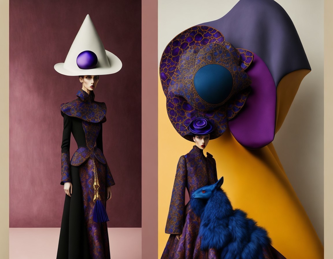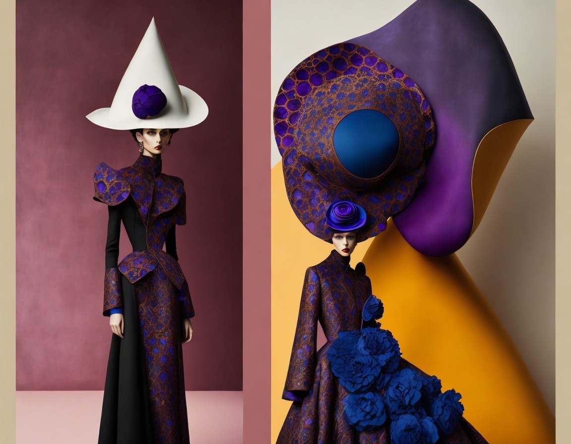 A striking fashion illustration featuring a model in a dramatic, purple-and-blue patterned gown with oversized sculptural hats, complemented by bold floral details against colorful backgrounds.