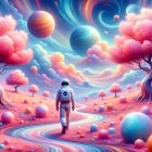An astronaut wanders through a vibrant landscape filled with pink, fluffy trees and colorful orbs. In the sky, a swirling galaxy and planets create a surreal, dreamlike atmosphere.