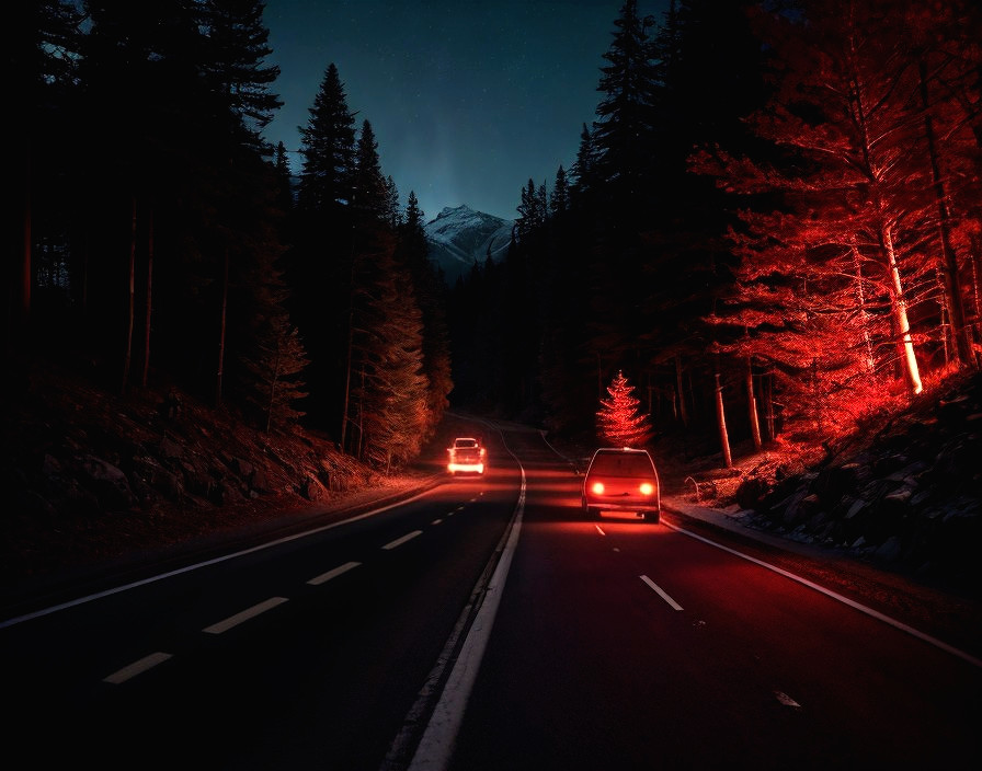 A dark, forested road is illuminated by red lights from cars, with towering trees on either side. In the distance, mountains are highlighted against a dramatic night sky.