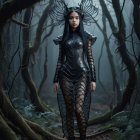 A figure stands confidently in a misty forest, wearing a striking black armor outfit with intricate detailing. The eerie atmosphere is accentuated by twisted trees and a mysterious ambiance.