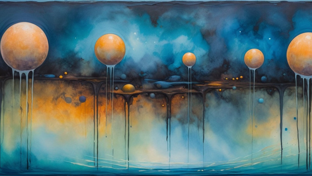 A vibrant abstract painting featuring colorful orbs in shades of blue, orange, and yellow. The background has soft, blended hues with dripping colors, creating a dynamic, fluid effect.