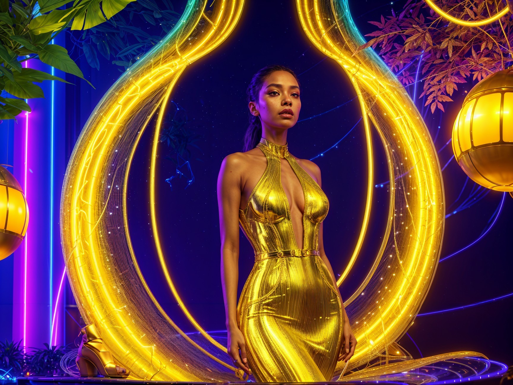 A stunning model in a shimmering gold gown poses elegantly within a luminous, circular frame surrounded by vibrant plants and colorful lighting, exuding confidence and glamour.