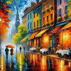 An evening European street scene depicts colourful buildings with autumn leaves. Patrons enjoy outdoor dining under warm lights, while two people walk under umbrellas, reflecting the serene, rainy atmosphere.