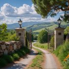 A picturesque entrance featuring ornate wrought-iron gates flanked by stone pillars. A winding path leads through lush greenery, with rolling hills and a bright blue sky dotted with clouds in the background.