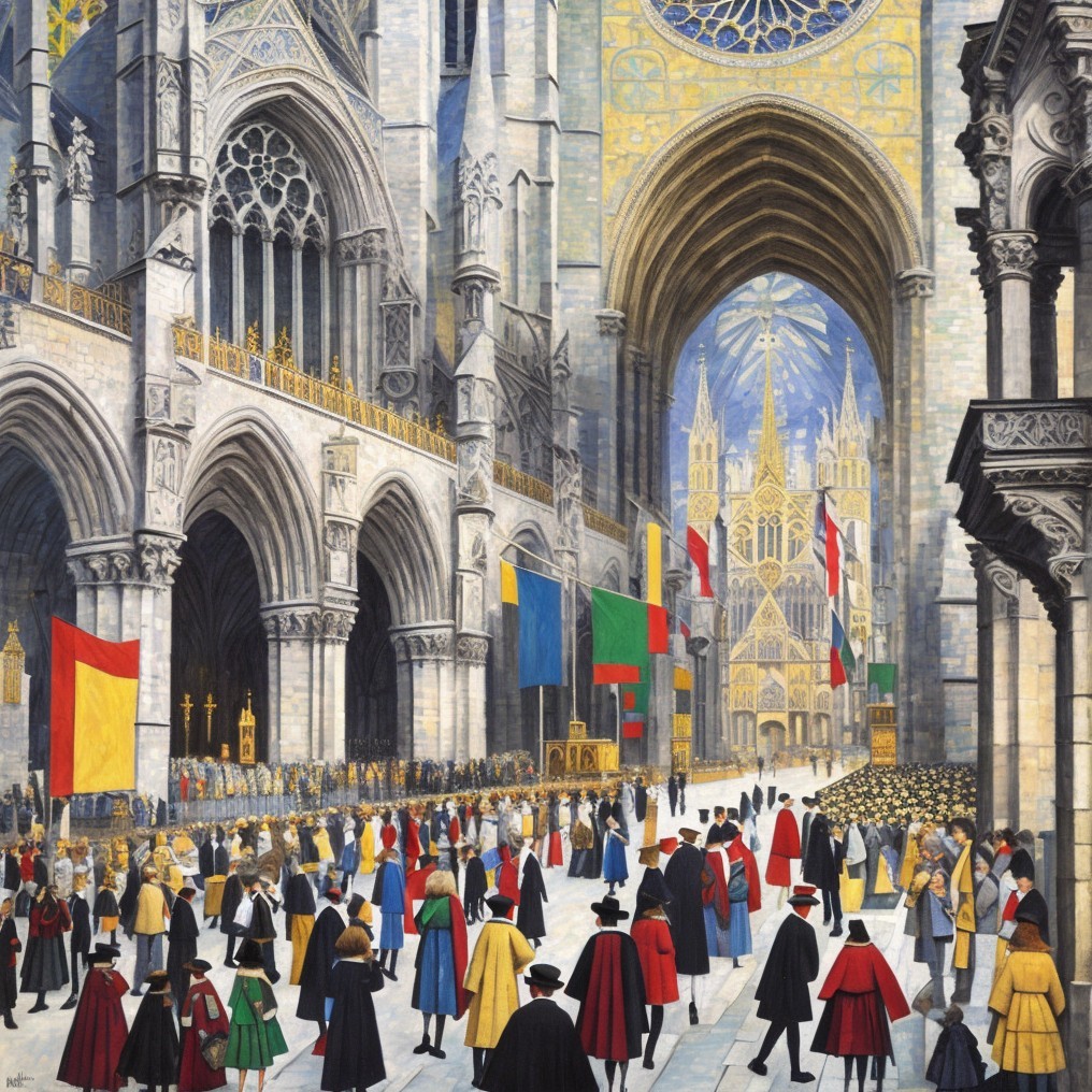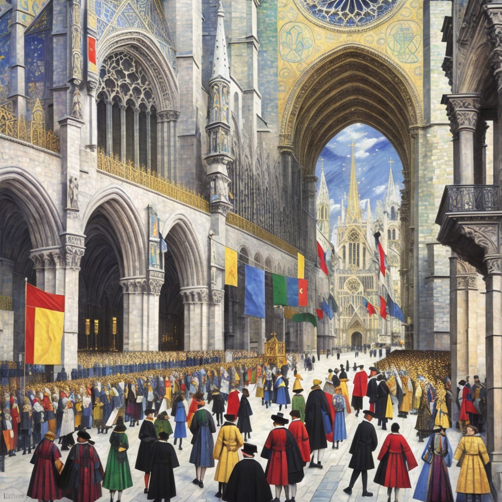 The image depicts a bustling cathedral interior with intricate architecture. Colorful flags hang, and a crowd in historical attire gathers, surrounded by vibrant flowers under a blue sky.