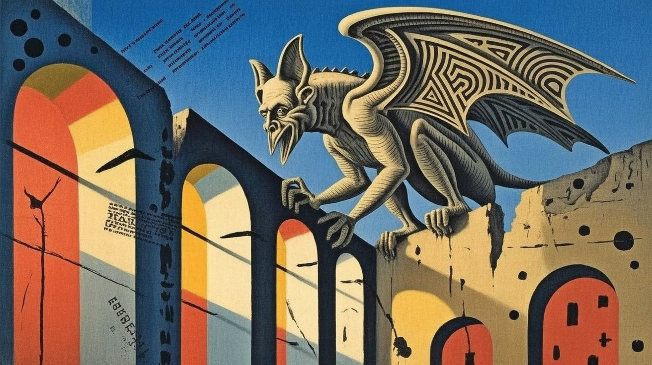 Stylized Gargoyle with Geometric Wings and Vibrant Background