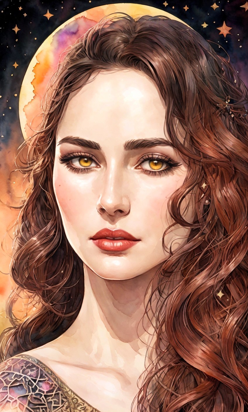 Portrait of gorgeous female enchantress,  watercolor and ink, black reddish-brown curly hair, american gothic 1.7, embossed strokes, painting comic, graphic novel, Bande Dessinée, ligne claire, highcoloring, hues, entertaining, highly detailed, layered composition, stylized illustration 1.8, muted colors, anisotropic filtering 1.7, surrounded by cosmical details, comical sketch art, geometrical illustrative style merged with storybook illustration, Science fiction illustration, style of dune by david lynch, headscarf, upper body portrait with stacked-up perspective, triadic color scheme black purple beige, complexion 1.4, colored ink drawing by Inna Kuzubova, digital artwork in withered pale colors, high detail, detailed, american gothic 1.3, dimmed dynamic lighting, high detail, muted colors 0.8, anisotropic filtering 1.7,  art nouveau, (steampunk (triadic color scheme yellow, ochre, burgundy) 6:11), inkpunk, background in Art Deco by Overton Loyd, perfect handsface, ornamental details in contrast colors, hyper detailed. Watercolor details, moving pose, (dark lilac background with tints of Geoff darrow, blurry illumination, intricate surrounding), tints of 1950s advertising art) 7:11), detailed plasticity, dreamscape, cinematic wash, grain, Schreger lines, luminous plasticity, 3d effects, echaustic strokes, spiritual essence ,shadow mapping 1.3, , auracore, dreamscape, mystical symbolism, magical realism, golden ratio, hues,grain, Schreger lines, stylized streamline_moderne depiction 1.8, ambient occlusion 1.5, raytraced shadows 1.8, sublime, eldritch, occult, Anglo gothic 1.6,