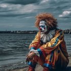A brightly dressed clown with dramatic makeup sits on a sandy beach, gazing contemplatively at the calm sea. A rustic pier stretches into the water under a cloudy sky.