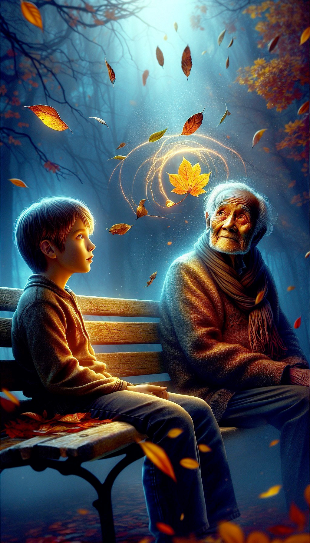 A young boy and an elderly man sit on a bench in an enchanted forest, surrounded by floating autumn leaves, sharing a moment of magic and connection under a mystical light.