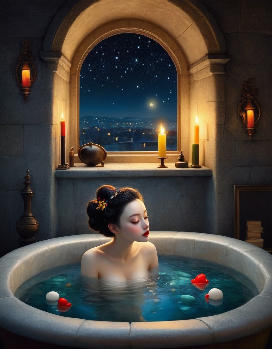 (Try it from other user) - A woman bathes in a serene, candlelit room overlooking a starlit night through an arched window, with flowers floating nearby.