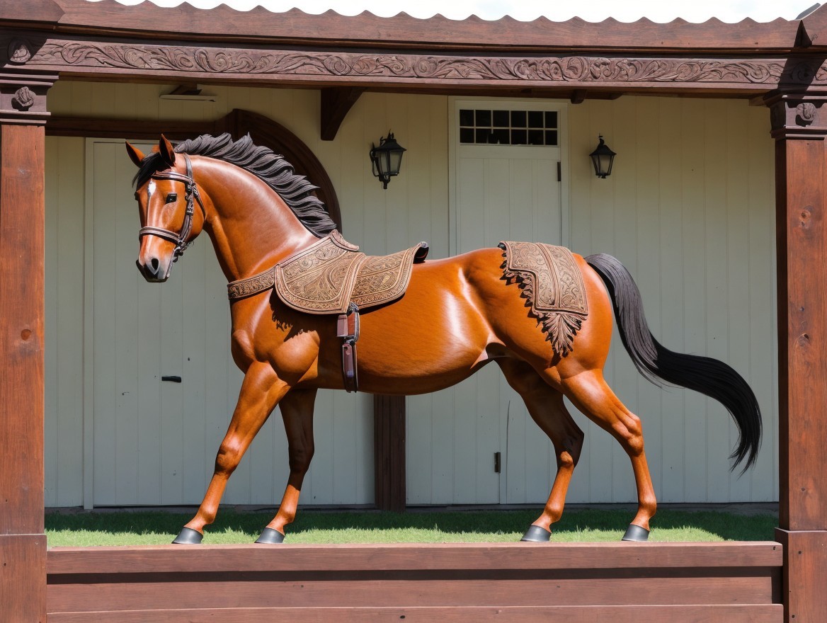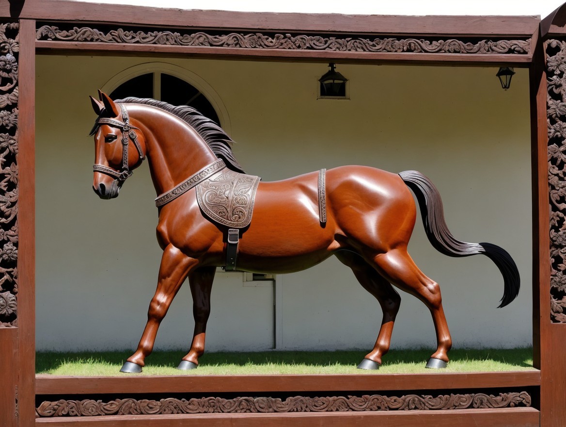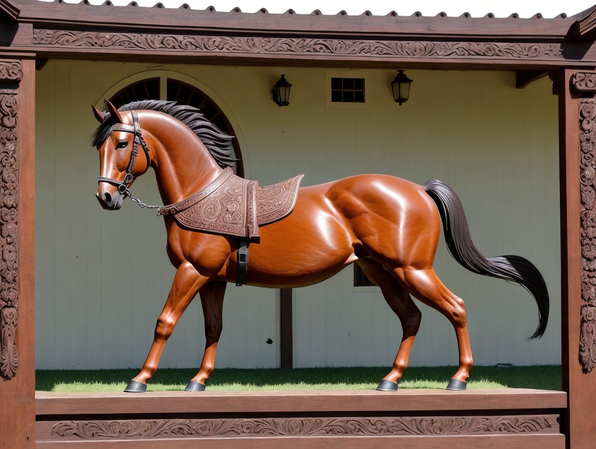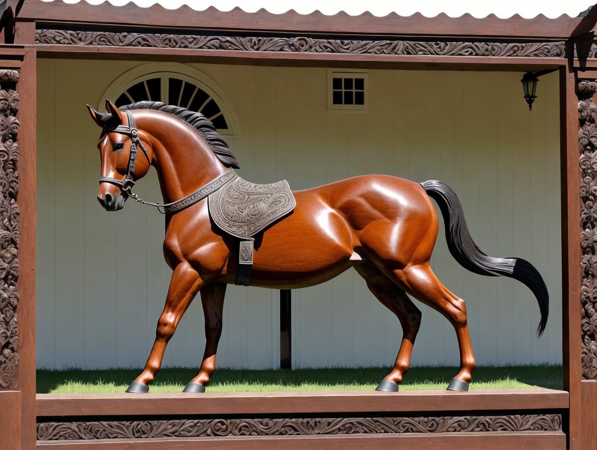 A beautifully crafted wooden horse model, featuring intricate carvings and a detailed saddle, stands on a grassy area in front of a charming wooden structure. It exudes an elegant, artistic flair.