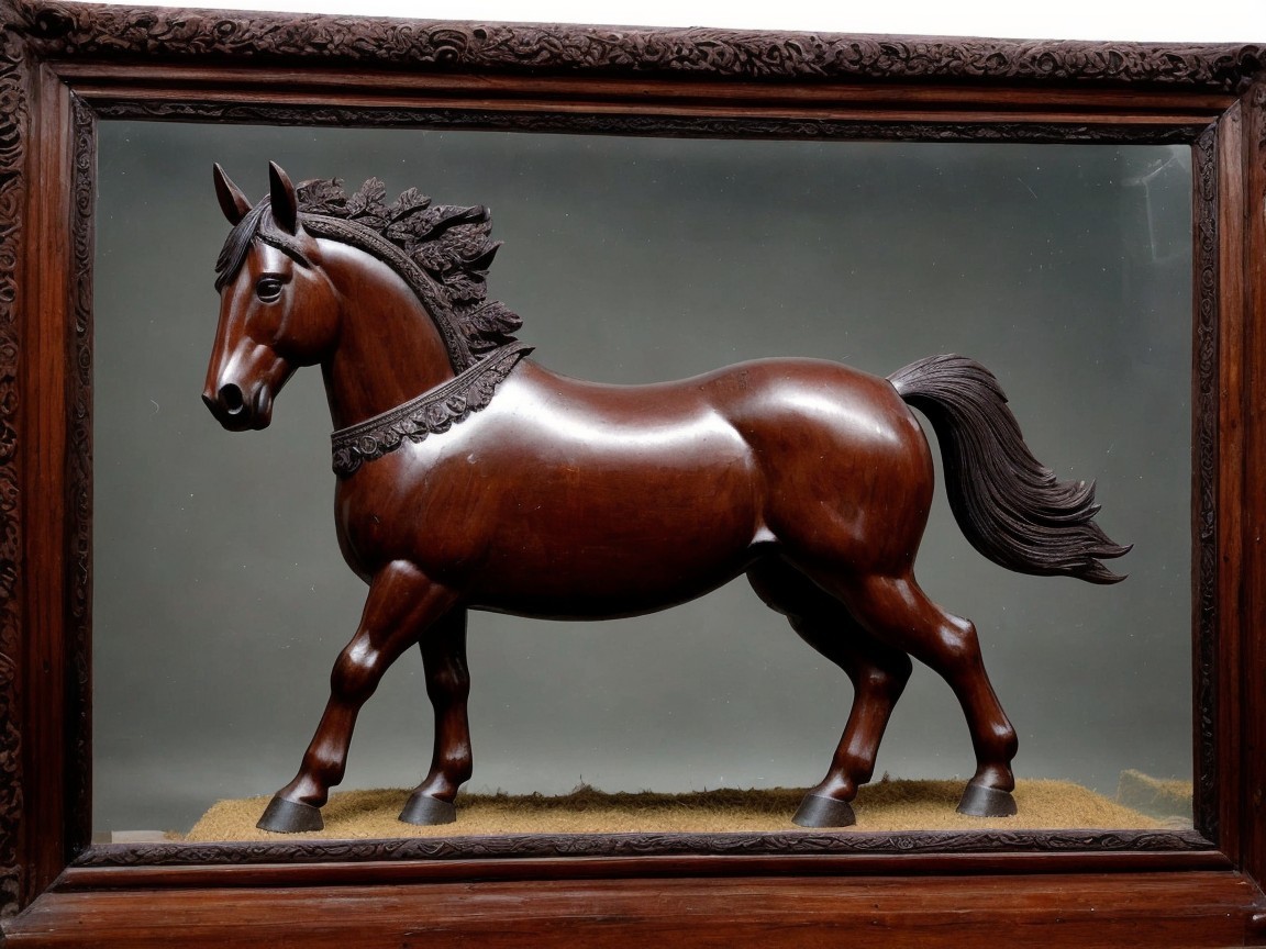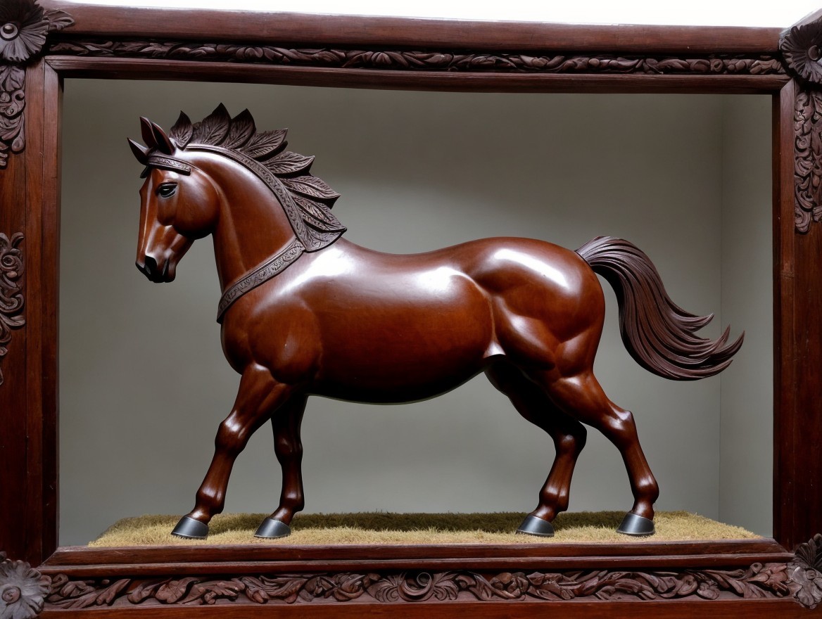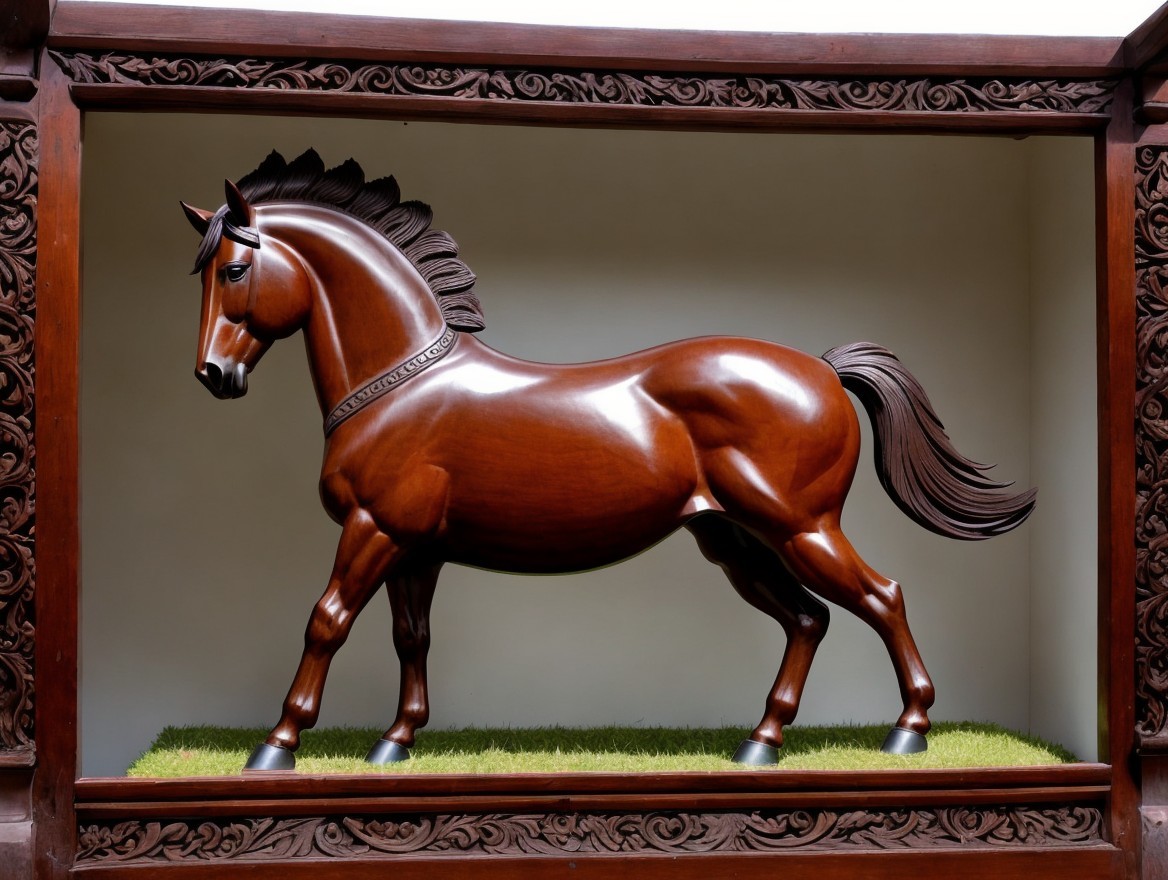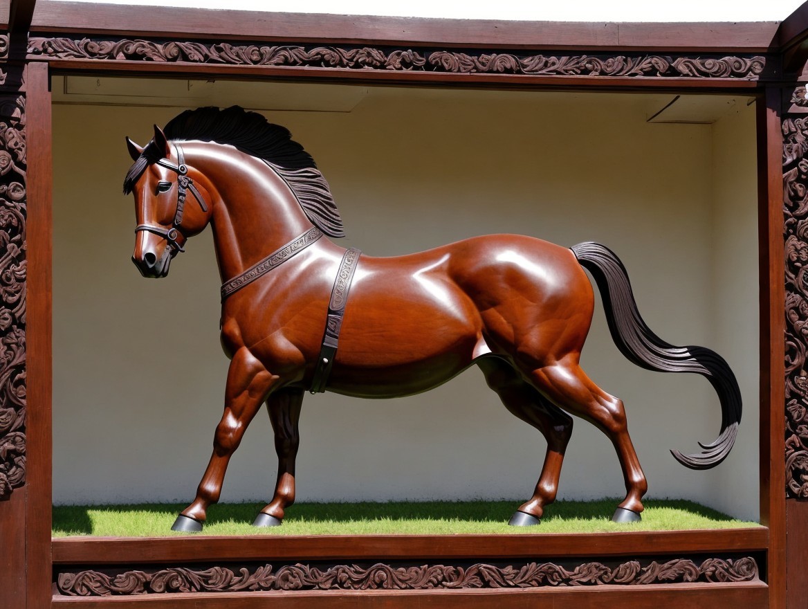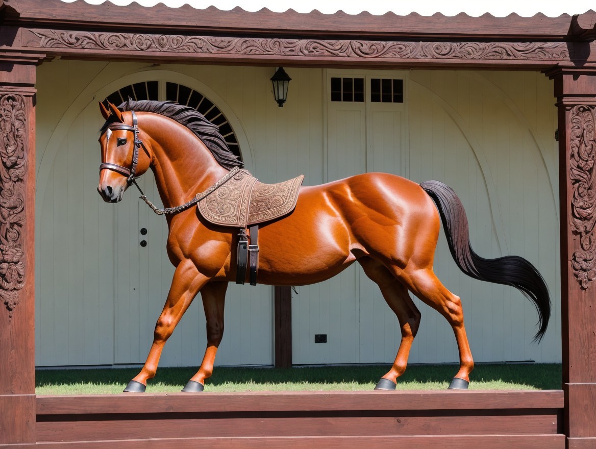 A beautifully crafted wooden horse model, featuring intricate carvings and a detailed saddle, stands on a grassy area in front of a charming wooden structure. It exudes an elegant, artistic flair.