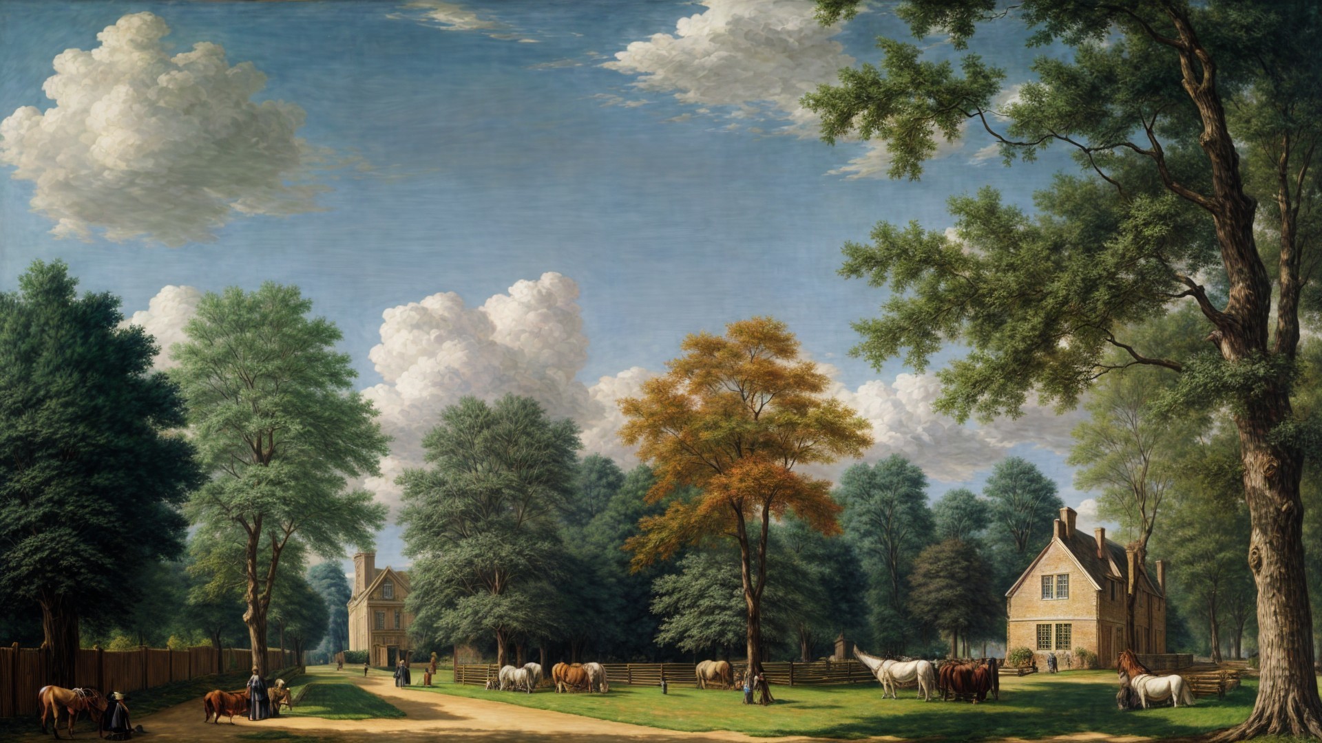 A picturesque rural scene depicts a grand manor surrounded by lush trees, grazing horses, and a serene sky. The idyllic landscape is dotted with greenery and a sense of tranquility.