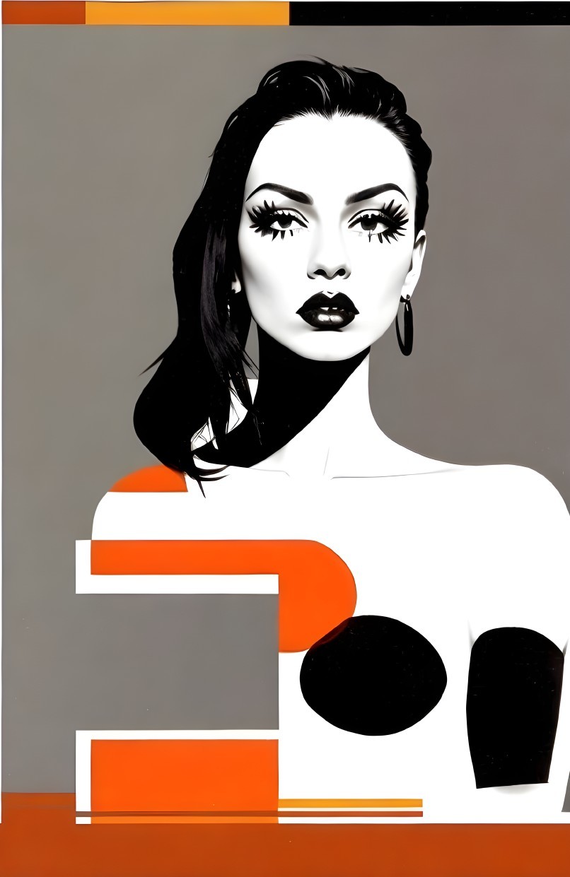 Monochrome image of a stylized woman with a punk hairstyle, wearing a top with bold orange graphics.
