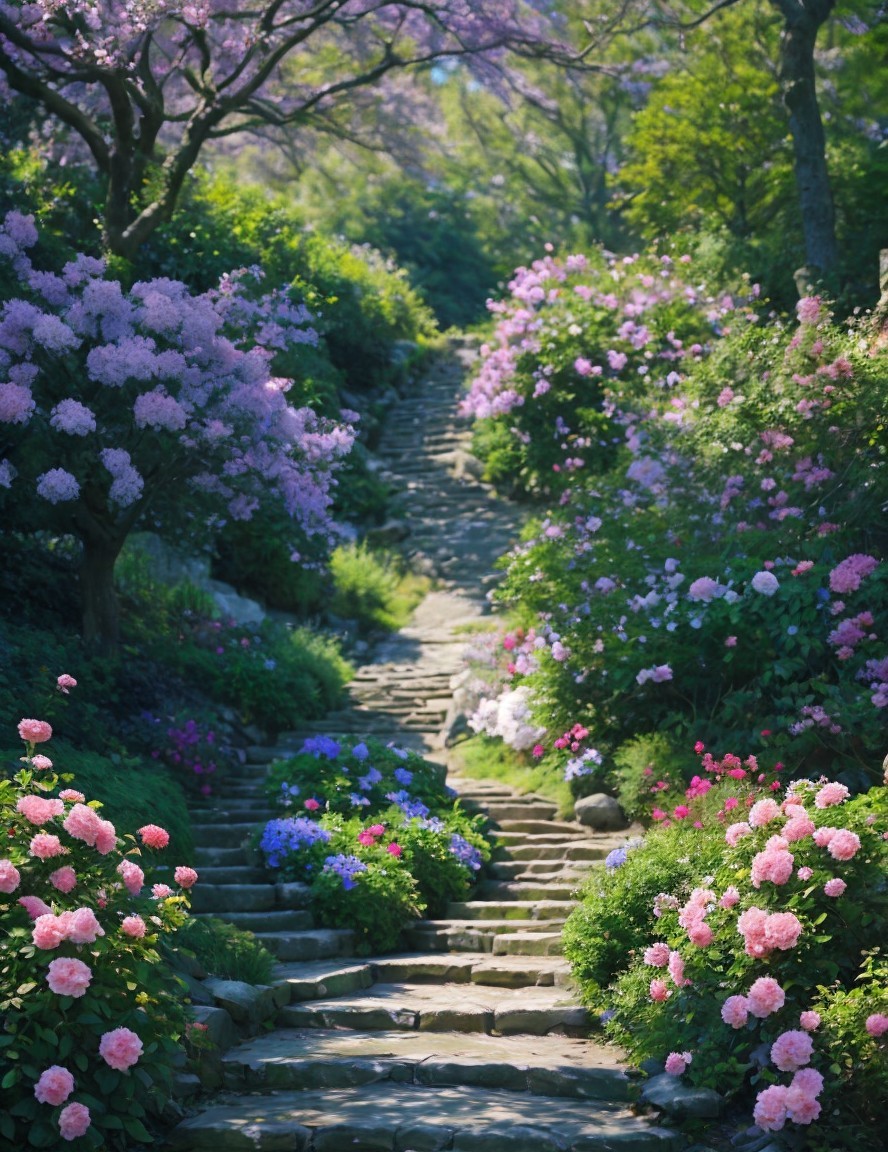 Stone Staircase Surrounded by Vibrant Flowering Shrubs