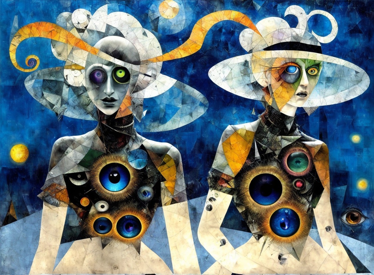Abstract art of two stylized figures with planetary and geometric elements, vibrant colors, and a cosmic theme. Yeah, you don't know do you.