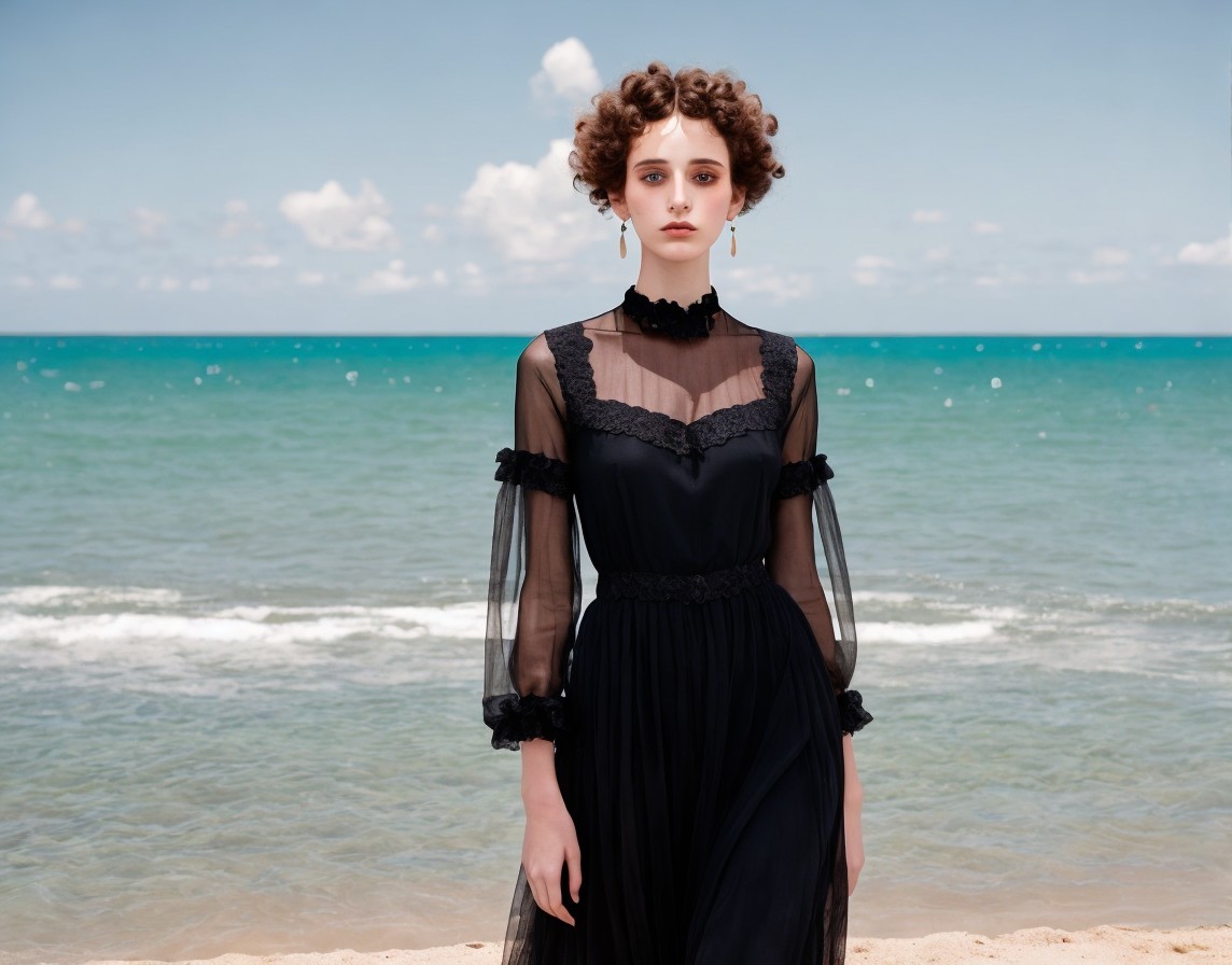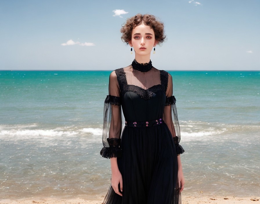 A painting of a woman with red hair and a black dress standing before a watercolor-like seascape with clouds