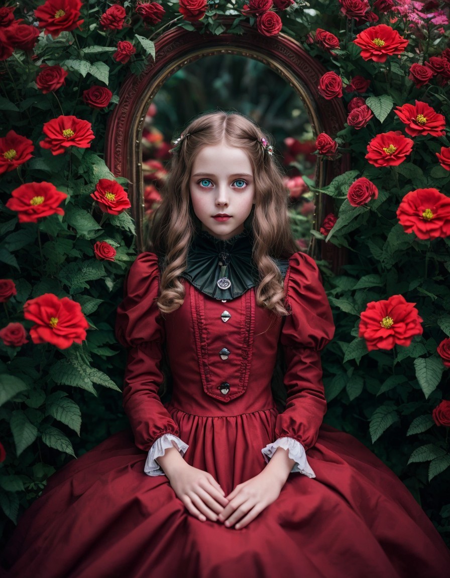 A young girl in a lush garden of red roses, wearing a vintage red dress with intricate details. She sits before an ornate mirror, exuding a mysterious and enchanting aura in this serene setting.