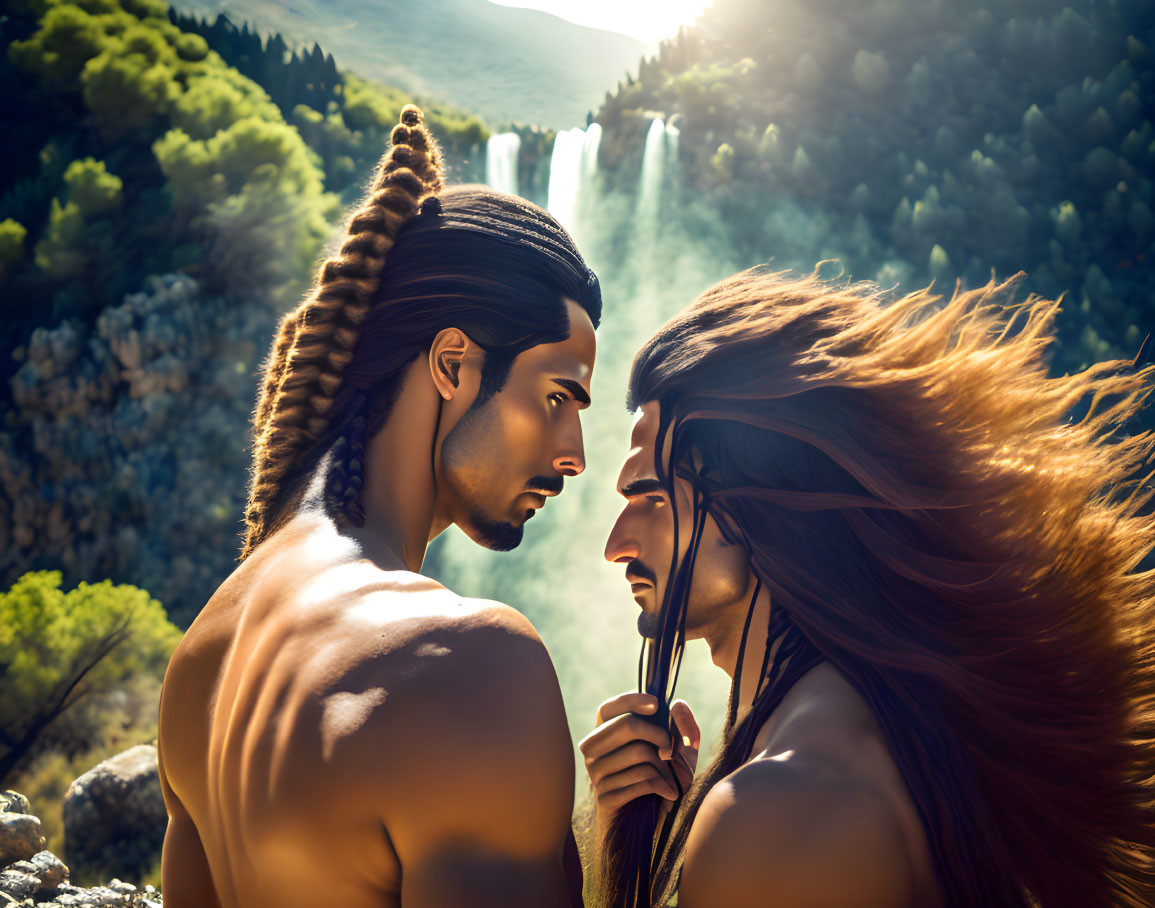 Animated characters with elaborate hairstyles in tense standoff with knives in forest.