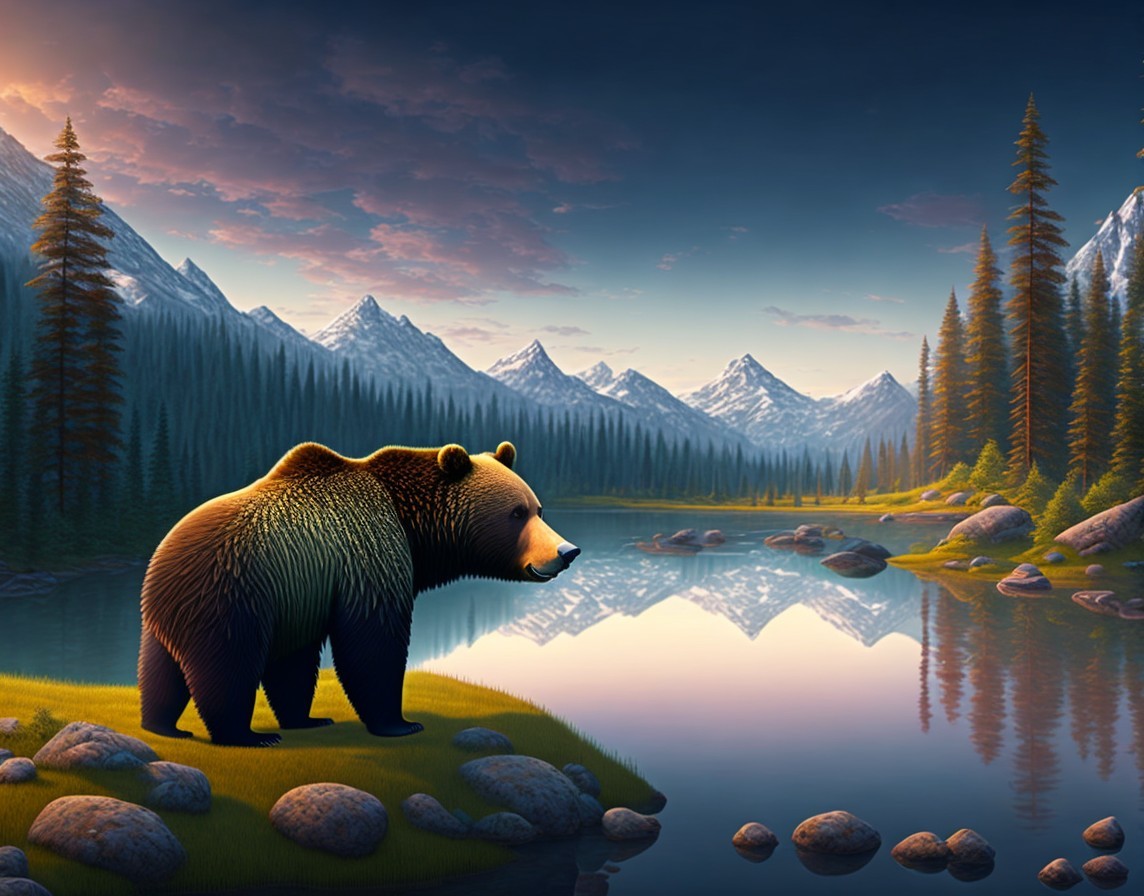 A bear by a tranquil lake at dusk with reflection, surrounded by forested mountains under a starry sky.