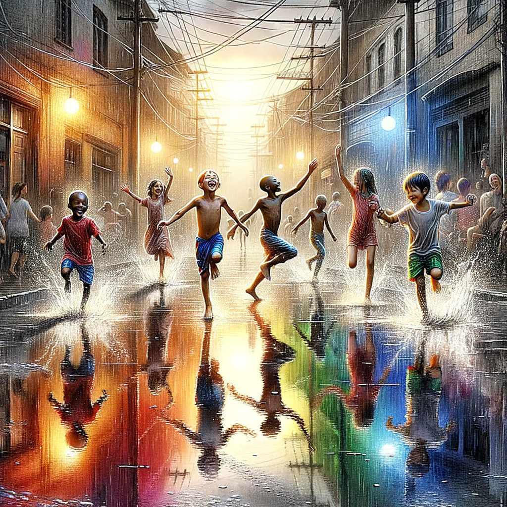 Prompt: "There were puddles around in the street, inviting. There were children playing and splashing, the street joyful.The water in the puddles was clear."