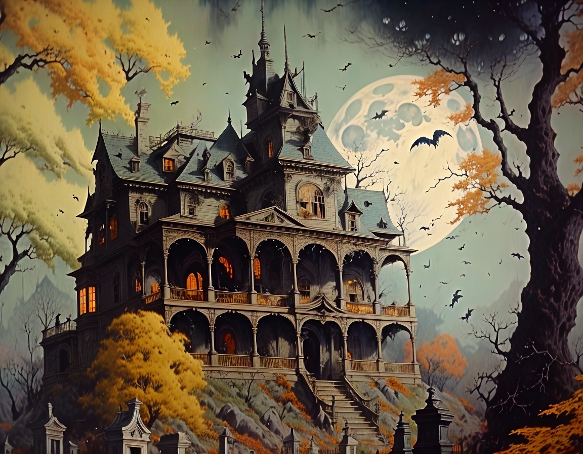 A hauntingly beautiful mansion looms under a full moon, its windows aglow with an eerie light. Surrounded by barren trees and gravestones, it evokes a sense of mystery and the supernatural.