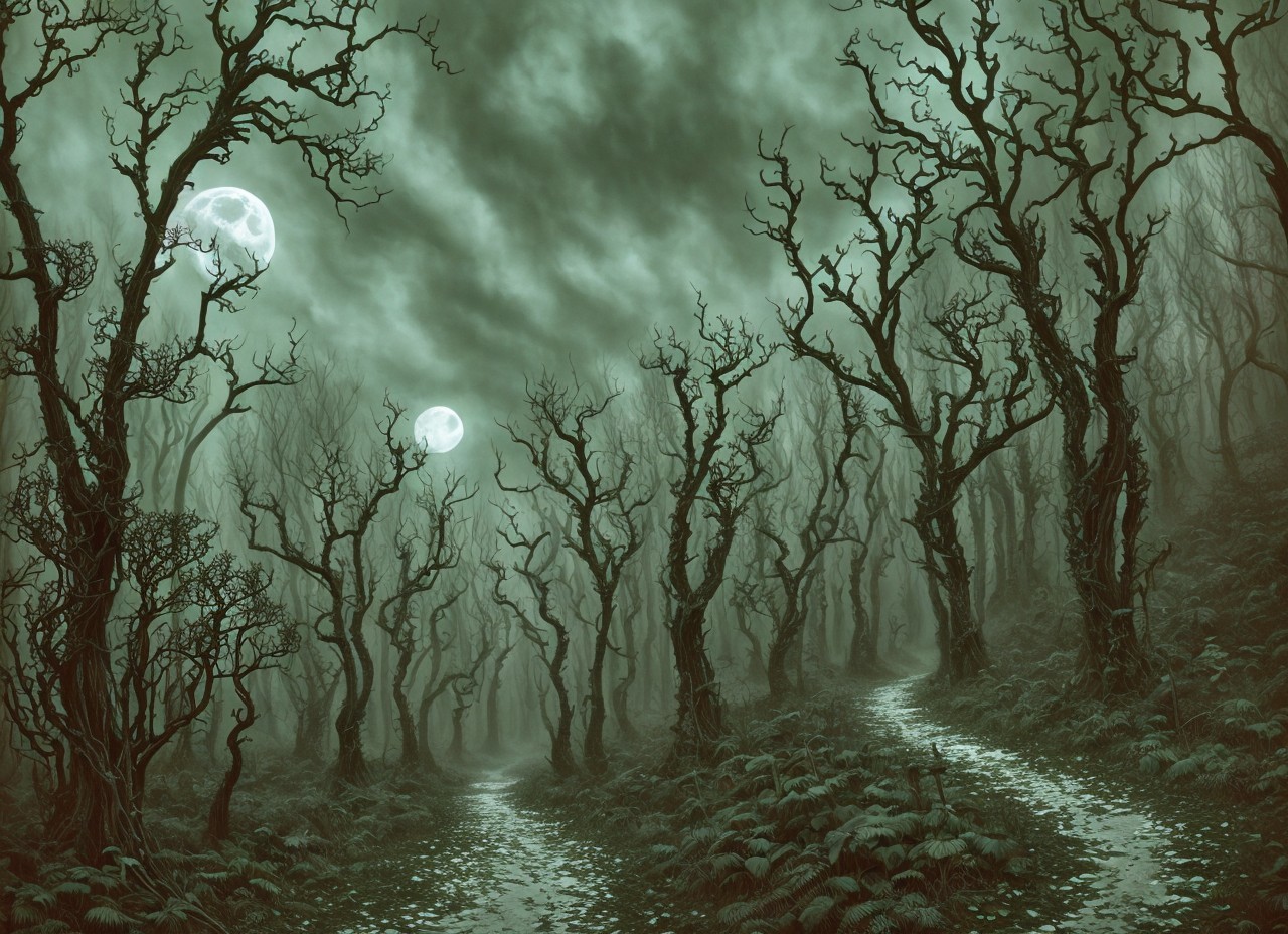 Prompt: "Lovecraftian Eldritch high gothic tim Burton style dark forest hallow oily black trees glowing white blue midnight moon flowers path through forest scary creepy scary intricate motifs perfect composition masterpiece insanely-detailed ultra-detailed extreme-detailed"